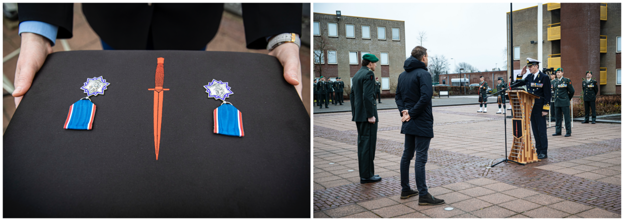 Ze kregen het ereteken op hun kazerne in Roosendaal uit handen van Plaatsvervangend Commandant der Strijdkrachten viceadmiraal Boudewijn Boots. “Het overviel mij een beetje. Zes jaar na dato. Maar het is een mooi gebaar”, aldus Peter. Michiel vult aan: “Het voelt ook dubbel. De aanleiding is ontzettend naar, maar de onderscheiding heel eervol.”