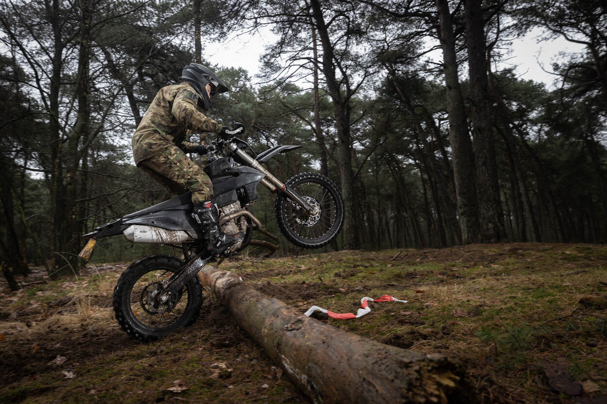 De groep verplaatst zich naar de glooiende rand van het Kreelsche Zand, een stukje bos naast de heide. Daar manoeuvreren de rijders tussen bomen en over boomstammen. “Waar de infanterie loopt moeten wij kunnen rijden”, vervolgt overste Hageman. “Hier gaat het niet om snelheid, maar om behendigheid en techniek. Zeker in dit weer kan een natte tak er al voor zorgen dat je neergaat. Daarom ben je constant bezig met vooruitkijken naar de beste route. Dat is driekwart van het werk.” Na een eerste ronde richt hij zich tot de cursisten: “De basishouding is zoveel mogelijk staan, ellebogen uit elkaar, tractie houden en het achterwiel sturen met je gewicht. Als de motor nu gekke dingen doet kun je reageren.”