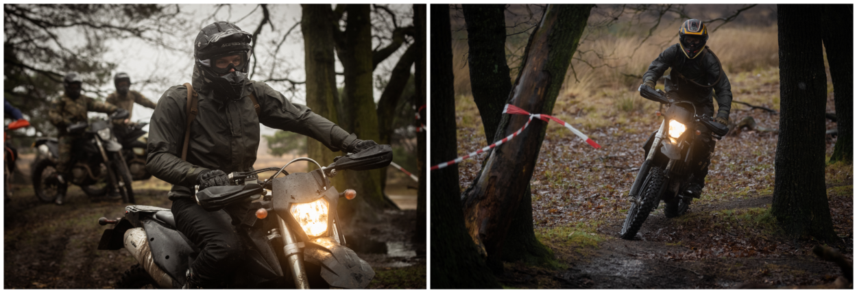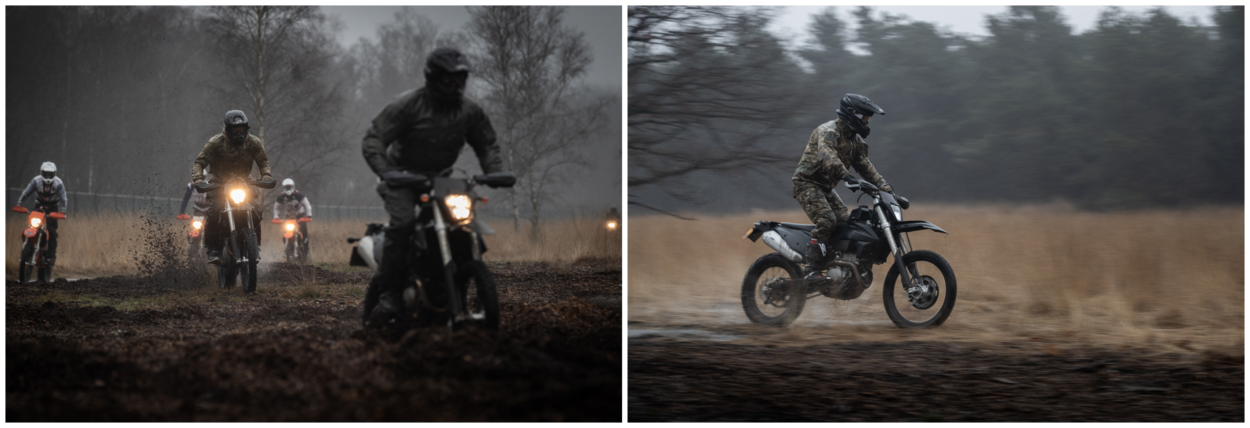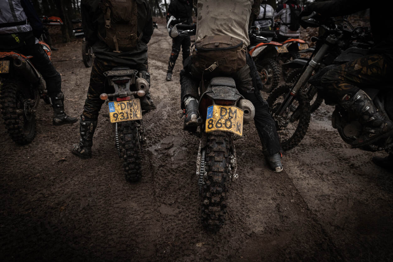 “Let op mannen! We beginnen vandaag met een paar rondjes inrijden op een single track. De ondergrond is hard, maar er zit een zachte bovenlaag op. Blijf gas geven, want anders gaat je motor glijden!”, instrueert Oldenziel zijn leerlingen. “We kijken hier goed naar het niveauverschil. De één is net omgeschoold op de nieuwe motor, de ander rijdt zelf ieder weekend offroad. Die eersten hebben wat meer individuele aandacht nodig en dat is prima!”, vertelt hij terwijl de eerste motoren er snerpend vandoor gaan.