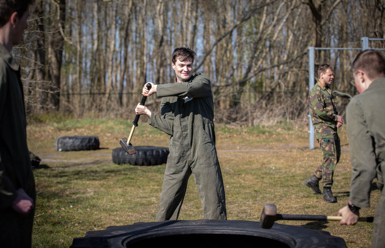 “Nog twintig minuten”, roept deelnemer Kevin Kerkenaar. Nu staat hij in groene overall een houten constructie te bouwen met zijn groep, maar normaliter doet hij jongerenwerk. “De MDT is iets strikter dan verwacht. Mooi, want die discipline heb ik wel nodig. Ik ben planningstechnisch niet zo sterk. En ik ben vrij assertief, neem graag de leiding: daarin moet ik nu een beetje afschalen. Nee, er wordt niet constant geschreeuwd, maar de opdrachten worden wel heel helder gecommuniceerd. Er is geen speld tussen te krijgen. Bijzonder om te zien hoe je met een groep individuen, onbekenden van elkaar, samen in korte tijd iets kan laten bereiken. Iedereen zet zich in en draagt zijn steentje bij.”