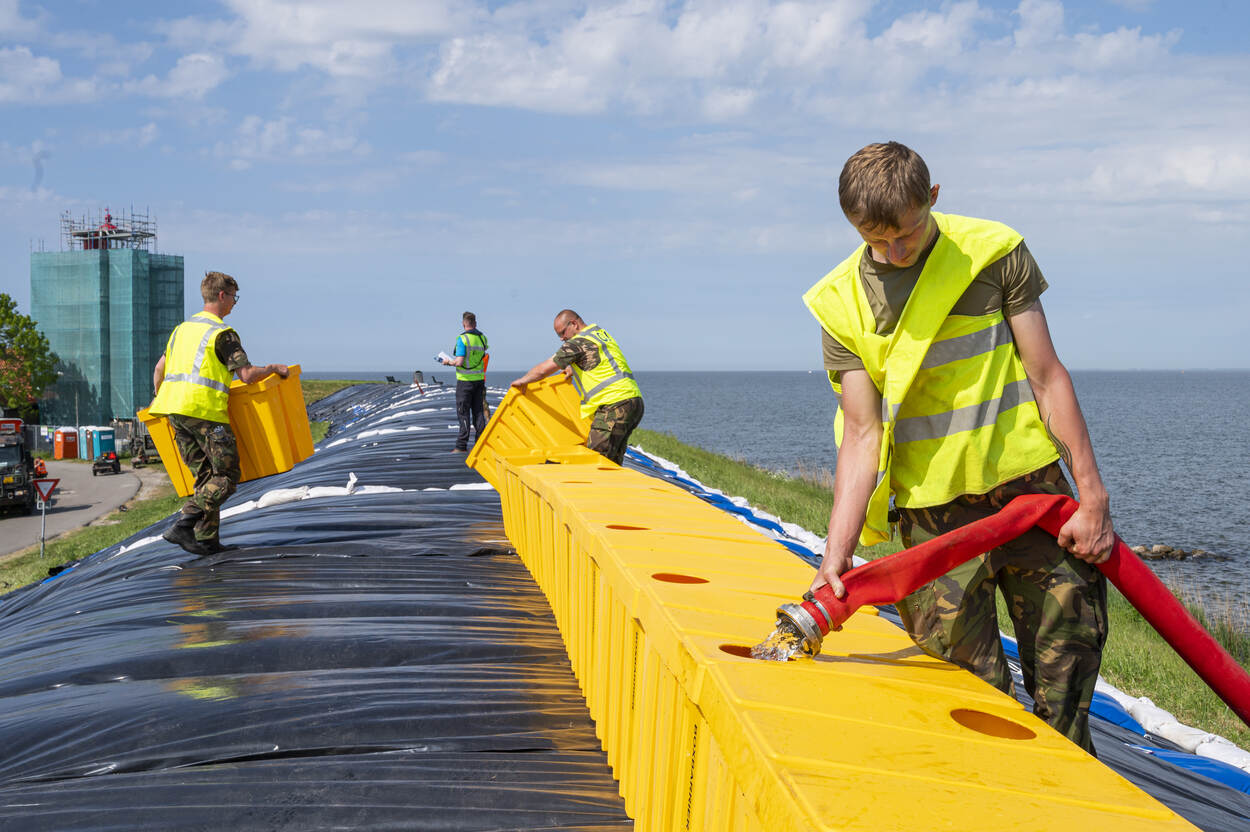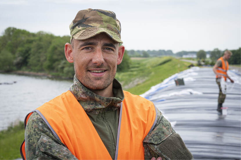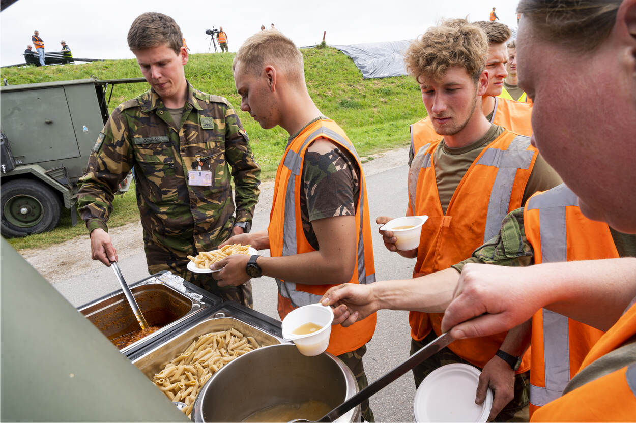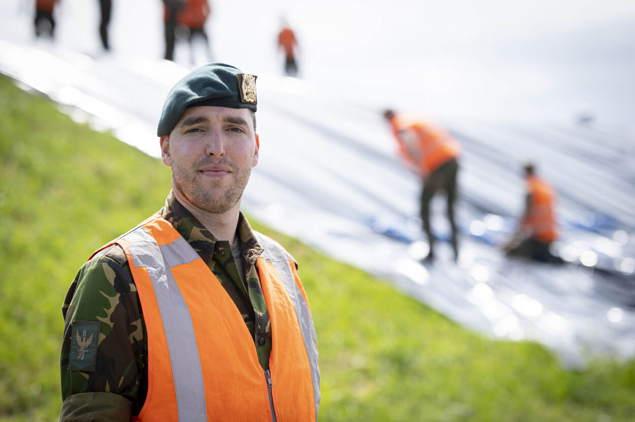 Op de dijk vuurt eerste-luitenant Van der Peijl, pelotonscommandant Advanced Constructieteam van 103 Constructiepeloton, de troepen onophoudelijk aan. “Vanwege de klimaatverandering is het een goede zaak om dit te trainen”, vertelt hij. “Als de nood aan de man komt moeten wij dit kunnen. Nu is het mooi weer, over bijvoorbeeld een maand kan het mis zijn. In de voorbereiding is het belangrijk om na te gaan wie het materiaal aanlevert: wij of onze civiele partner? Hoe meer je dingen weet van de andere partij, hoe beter. Die werkt nu eenmaal anders dan wij. Er staat hier een tevreden man. We oefenen in iets waarmee we de bevolking kunnen helpen als het erop aankomt. Dankbaar werk.”