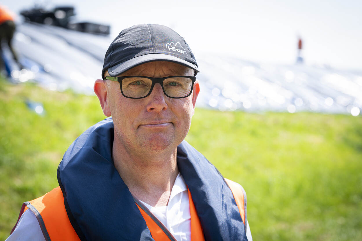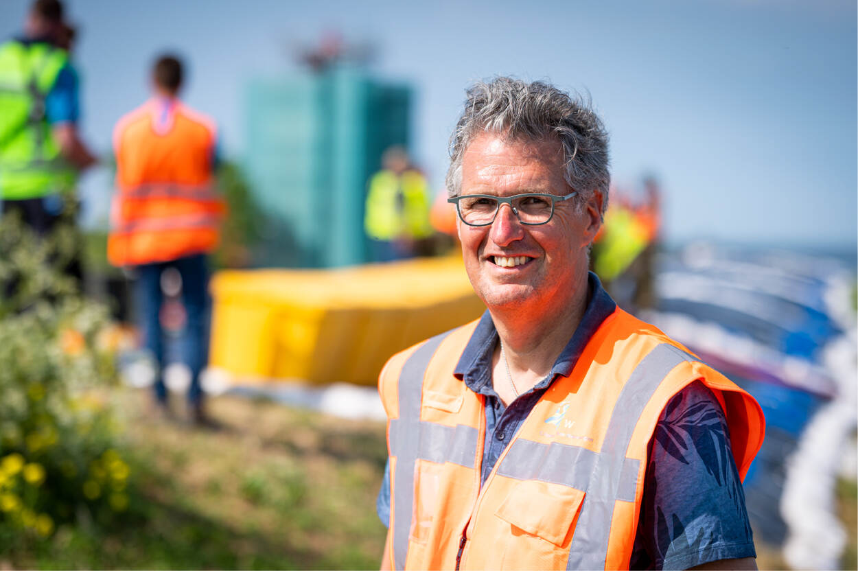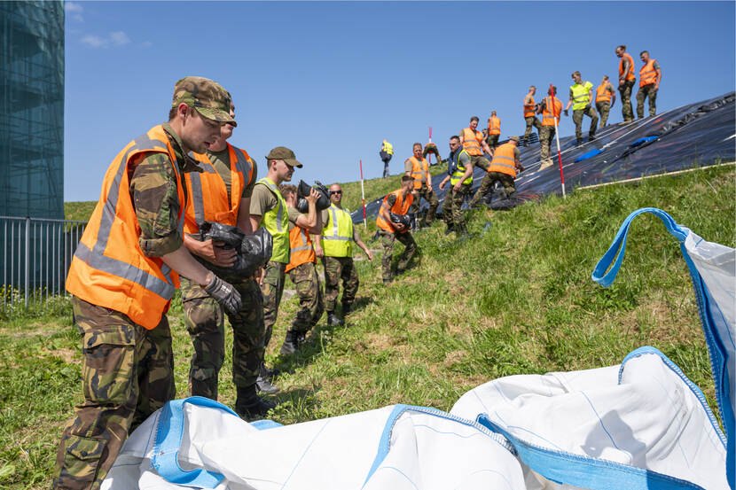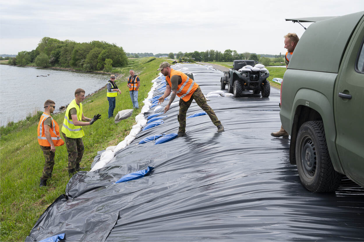 Op de dijk vuurt eerste-luitenant Van der Peijl, pelotonscommandant Advanced Constructieteam van 103 Constructiepeloton, de troepen onophoudelijk aan. “Vanwege de klimaatverandering is het een goede zaak om dit te trainen”, vertelt hij. “Als de nood aan de man komt moeten wij dit kunnen. Nu is het mooi weer, over bijvoorbeeld een maand kan het mis zijn. In de voorbereiding is het belangrijk om na te gaan wie het materiaal aanlevert: wij of onze civiele partner? Hoe meer je dingen weet van de andere partij, hoe beter. Die werkt nu eenmaal anders dan wij. Er staat hier een tevreden man. We oefenen in iets waarmee we de bevolking kunnen helpen als het erop aankomt. Dankbaar werk.”