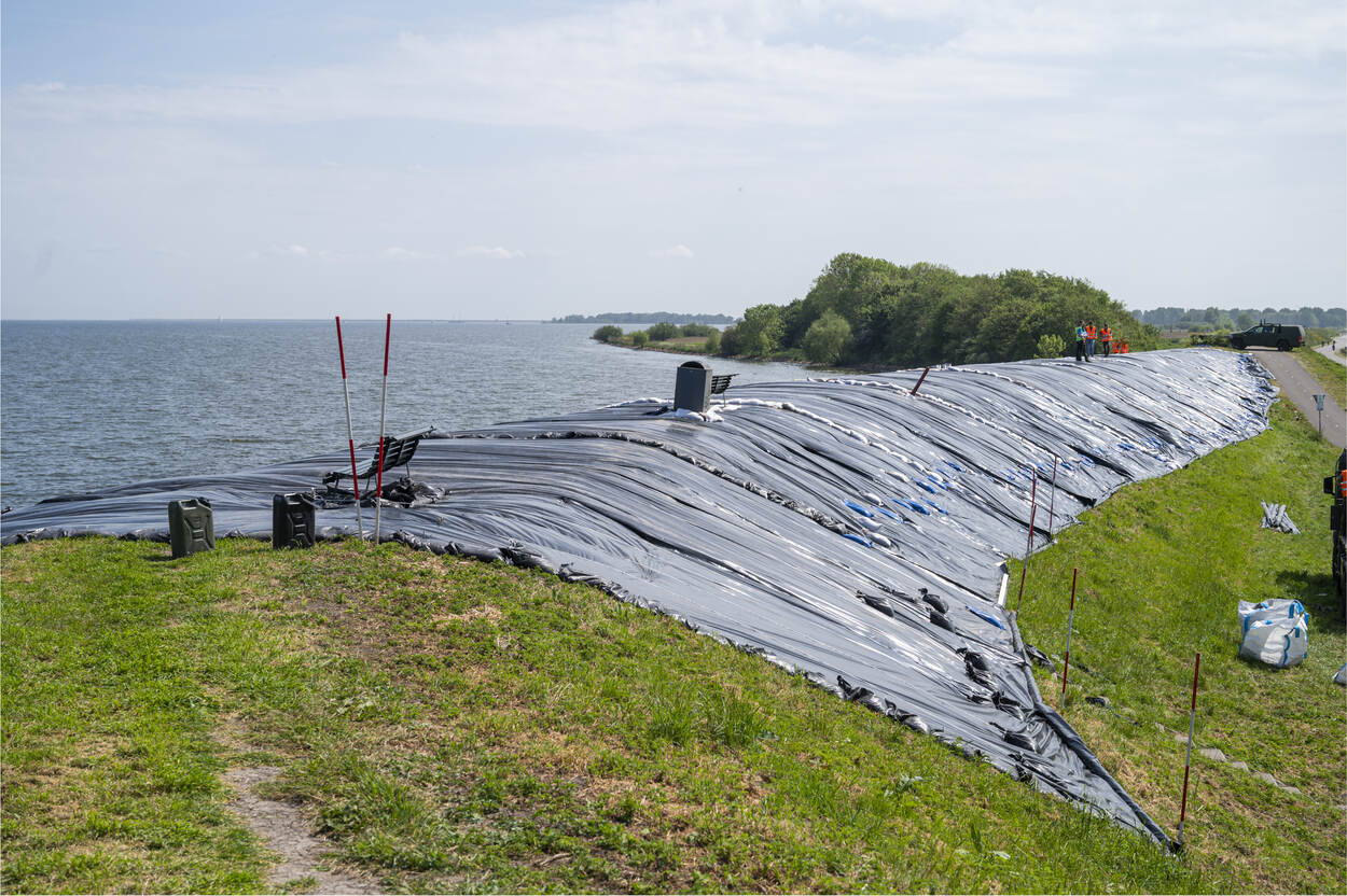 De Oosterdijk bij Den Helder is ‘ingepakt’ met zeilen van kunststof. Het gewicht van de zandzakken zorgt ervoor dat het zeil blijft liggen.