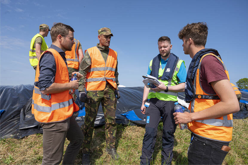 Coördinator Kay van Boxem van het Hoogheemraadschap Hollands-Noorderkwartier (tweede van rechts) overlegt met militairen van 101 Geniebataljon.