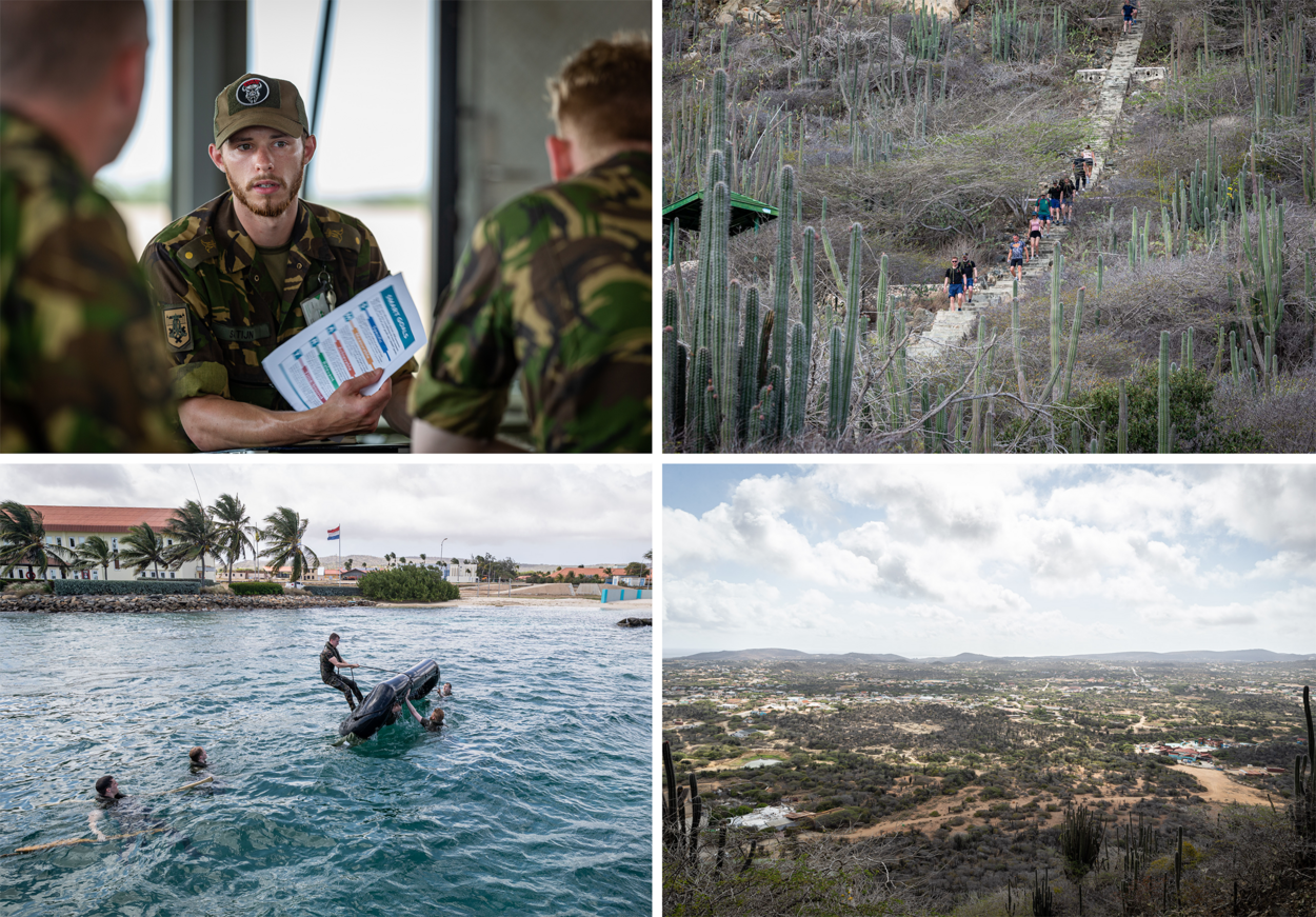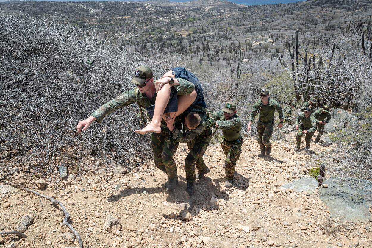 De eerste dag begon met de opdracht een oefenslachtoffer honderd meter bergopwaarts te tillen. Een activiteit die in Nederland weinig moeite zou kosten… maar op Aruba betekent het flink transpireren. “Het had best een impact omdat we nog niet waren geacclimatiseerd”, blikt vaandrig Marijn Theunis terug. De warmte en bewolking zorgen voor een hoge luchtvochtigheid. “De ademhaling ging sneller omhoog en ik kreeg eerder spierpijn.”