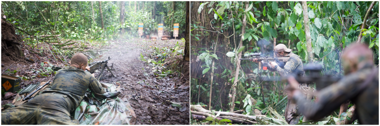 Waar in Nederland nog weleens een munitietekort is, ontbreekt het de infanteristen bij de jungletraining niet aan scherpe patronen.