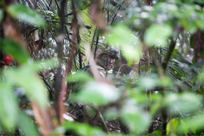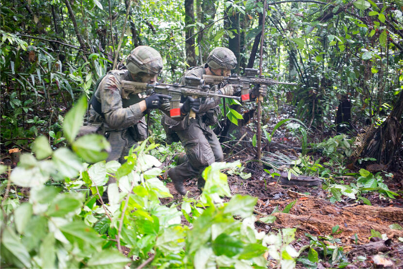 Behoedzaam lopen buddyparen achter elkaar aan de dichtbegroeide rimboe in. Ze zijn slechts een paar meter in het zijterrein, toch is navigeren lastig. “De jungle in Belize, waar we de afgelopen jaren veel ervaring opdeden, kent meer hoogtemeters die je als referentiepunten gebruikt,” vertelt sergeant Abel, instructeur tijdens de Live Fire Excercise. De route uitstippelen is niet het enige wat opperste concentratie vereist. “Alles om je heen vormt een mogelijk gevaar: zware takken kunnen naar beneden vallen, bastard trees laten lange doorns achter in de huid en de moddergrond is na een zware regenbui spekglad.” Laten de infanteristen nu net in het regenseizoen hun jungletraining hebben opgetuigd.