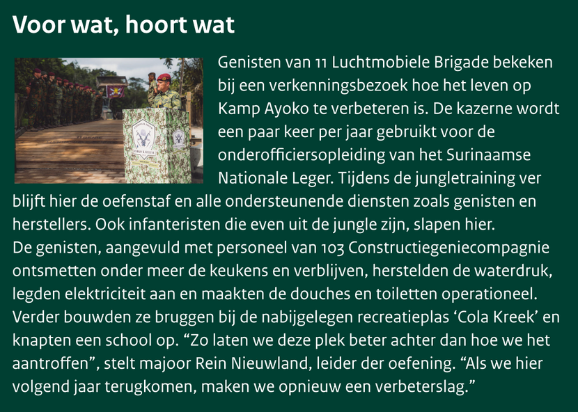 Deze zomer wordt besloten of de jungletraining volgend jaar opnieuw in Suriname plaatsvindt. Er zijn politieke belangen, maar natuurlijk hebben de eenheden zo ook hun wensen. Bij 11 Luchtmobiele Brigade kijken ze nu in ieder geval terug op een geslaagde oefening. “We hebben er bíjna alles uit kunnen halen”, stelt majoor Rein Nieuwland. “Als we hier terugkomen hebben we een groter oefengebied nodig. Daarover is te praten met de Surinaamse collega’s.” Daarnaast ontbrak deze jungletraining een lier aan de gehuurde helikopter die gereed stond voor medische evacuaties. “We oefenden niet zo diep in de jungle om eventuele gewonden snel over de weg naar de heli te kunnen brengen. Ideaal is anders. Hierdoor moesten we de eindoefening schrappen en krijgen de instructeurs geen certificaat maar slechts een bewijs van deelname. En dat terwijl we krap zitten in het aantal collega’s die jungle warfare opgeleid zijn.”