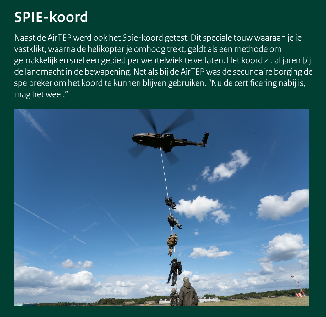De AirTEP is een revolutionair systeem van Franse makelij. Wereldwijd zijn er twintig landen die het gebruiken. De mogelijkheden van de, met een beetje fantasie, ‘omgekeerde paraplu’ beperken zich volgens Van Rens niet alleen tot het militaire domein. Zo zette de Canadese brandweer een AirTEP in om mensen van het dak van een brandende flat te halen. Defensie kocht het systeem op verzoek van de Special Operating Forces van het Korps Commandotroepen. Zij willen het apparaat hebben voor hun Special Patrol Insertion and Extraction Operations. Van Rens merkt op dat de toestellen bestemd zijn voor de gehele special forces-gemeenschap. Naast operators uit Roosendaal gaan ook leden van de Brigade Speciale Beveiligingsopdrachten van de marechaussee, de Maritime Special Operating Forces van de mariniers en de Dienst Speciale Interventies met het systeem werken. “Gelet op de aard van hun werkzaamheden horen de pathfinders van 11 Luchtmobiele Brigade en de duikers van 11 Geniecompagnie er ook bij.”