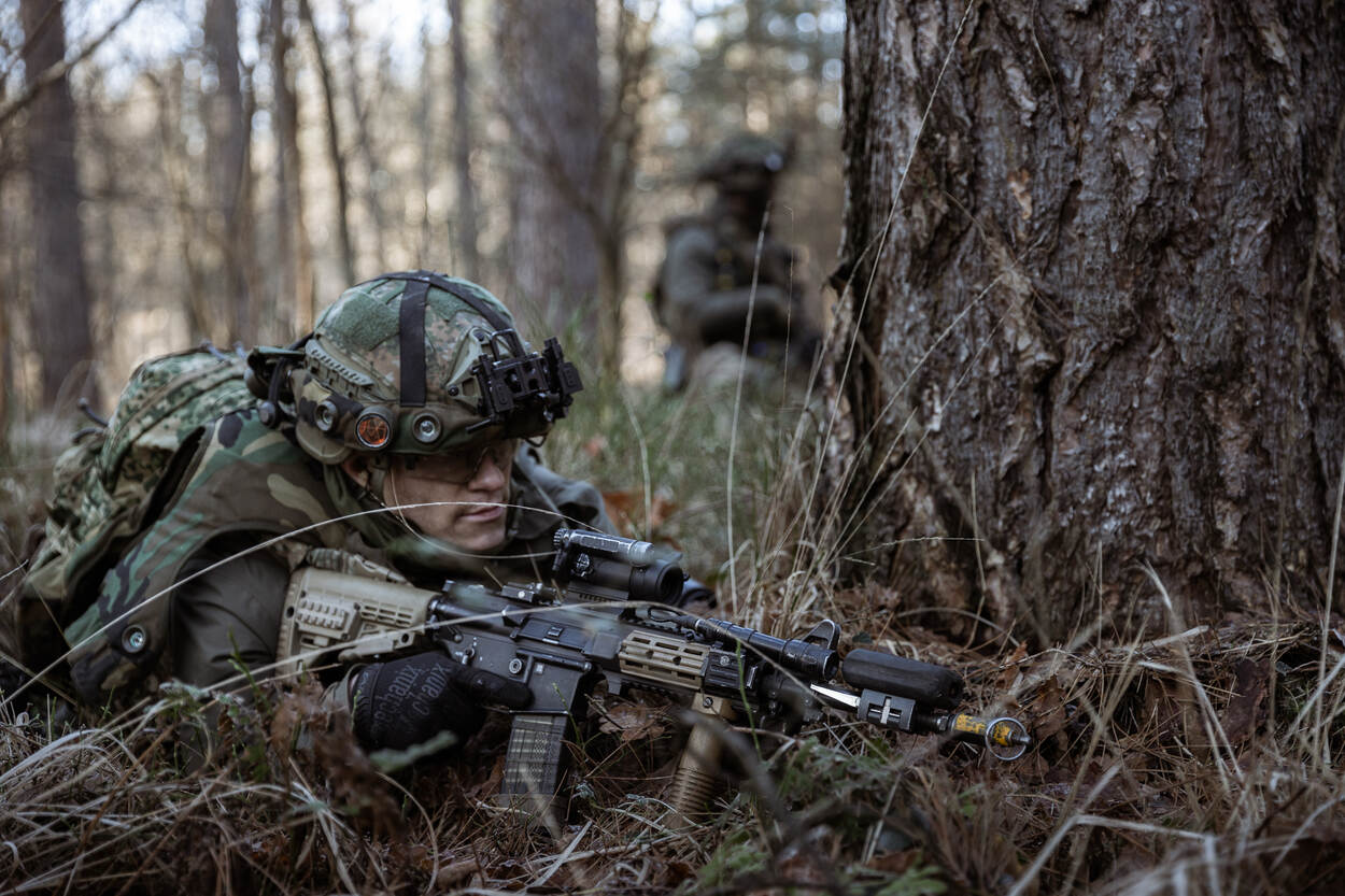 Een noodzakelijke training, vertelt hij. “De focus in optreden lag vooral op hoofdtaak twee (het bevorderen van de (internationale) rechtsorde en stabiliteit, red.). De afgelopen jaren was Optreden Verstedelijkt Gebied daarvan de hoofdmoot. Het échte groene bosoptreden stond op een lager pitje. Maar met de oorlog in Oekraïne wordt weer heel duidelijk dat dit grondoptreden van infanteristen verre van verleden tijd is.”