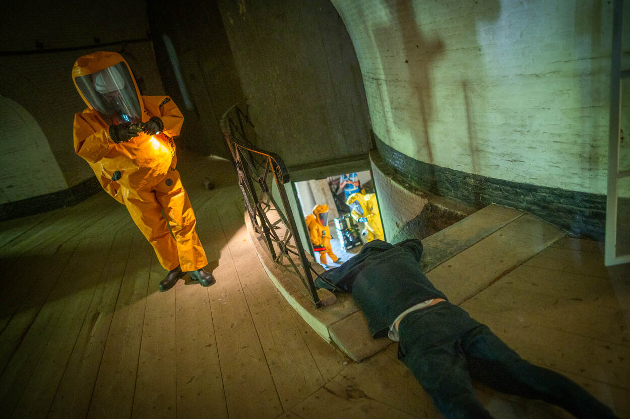 In de kille catacomben van Fort Everdingen lopen 2 wezens. Rechtop, 2 benen, 2 armen. Hun stemmen klinken vervormd. Het zijn militairen in bizarre oranje en gele pakken. Ze lijken rechtstreeks uit een sciencefiction verhaal gekropen.