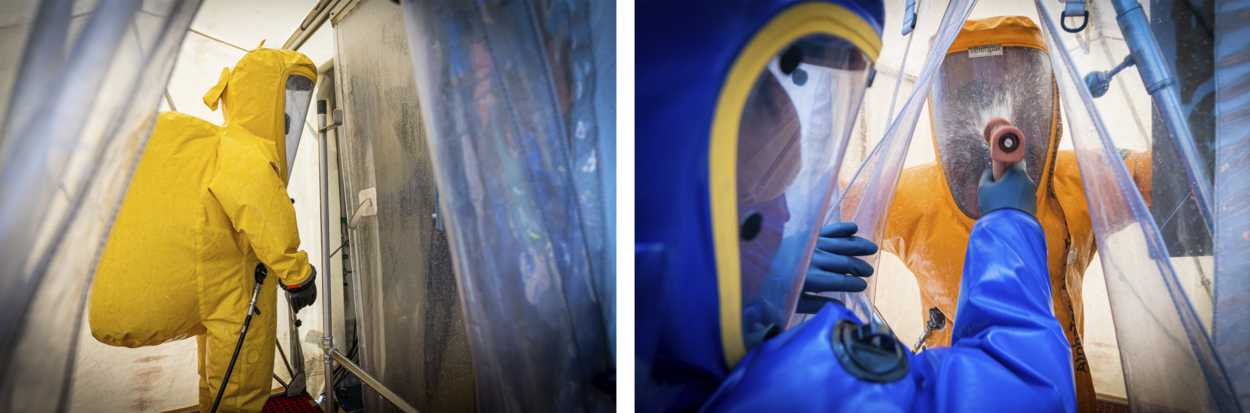 Nadat de verkenners in een besmette omgeving zijn geweest, moeten ze door een wasstraat om stofjes van hun pak te spoelen.