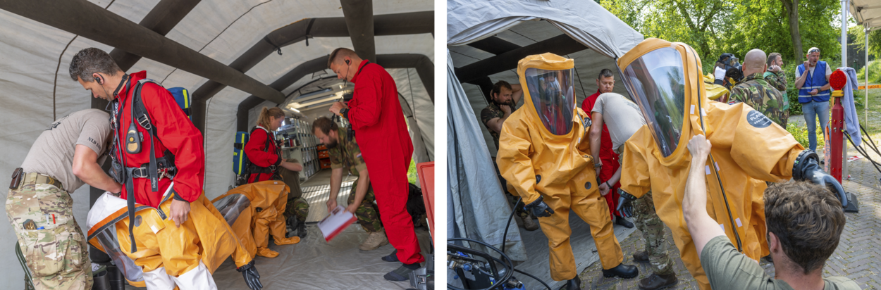De beschermende gaspakken heb je niet 1-2-3 aan, daar heb je hulp bij nodig. De pakken zijn luchtdicht om besmetting te voorkomen. Zuurstof krijgen de collega’s via perslucht.