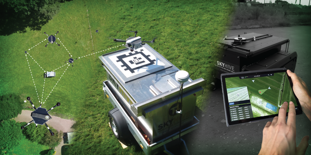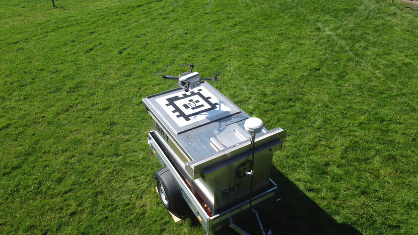 De drone landt autonoom door te mikken op de QR-code op de SkyHive. Na het landen kan de batterij direct worden ‘geswapt’: zo kan de drone binnen 1 minuut alweer de lucht in. De lege batterij wordt vervolgens opgeladen in het laadsysteem van de hive. Omdat er per drone 3 batterijen beschikbaar zijn, kunnen alle 5 drones permanent in de lucht blijven terwijl lege batterijen opladen.