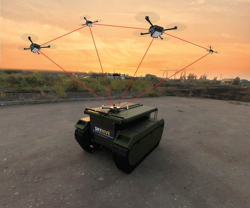 Dan SPEAR zelf. De hardware omvat een dronebox, de SkyHive. Hieruit kunnen 5 drones tegelijk opereren: opstijgen, landen, batterijen wisselen en weer opgeslagen worden. De drones wegen maximaal 5 kilogram en kunnen een gebied van 5 bij 5 kilometer afspeuren. ‘Een bewuste keuze, vertelt Hädicke. “Tot 5 kilometer is de te verwachten span of control waar een peloton vat op probeert te krijgen.” Een grotere afstand was mogelijk, echter: “Hoe verder, hoe groter en zwaarder de drone.” Daarom valt het systeem nu ook op in haar compactheid: “Het geheel past in een aanhanger.”