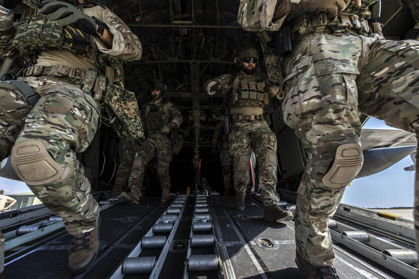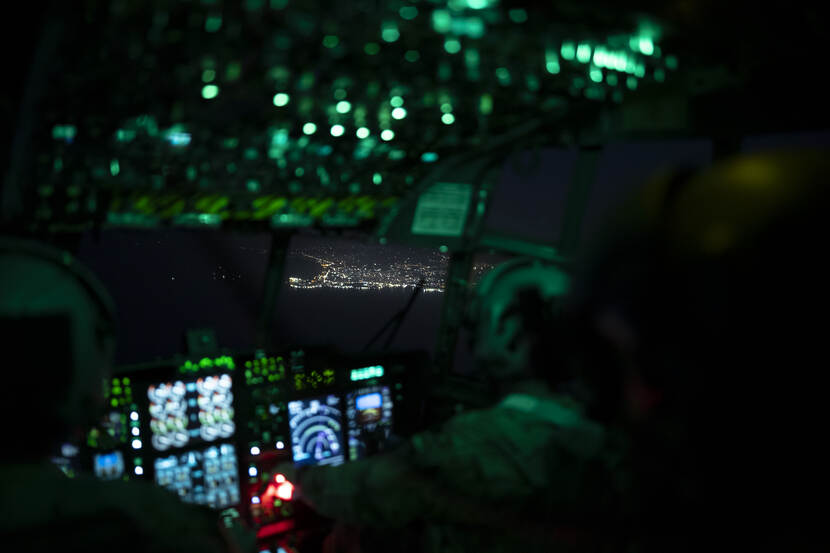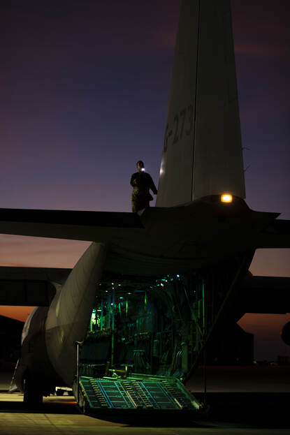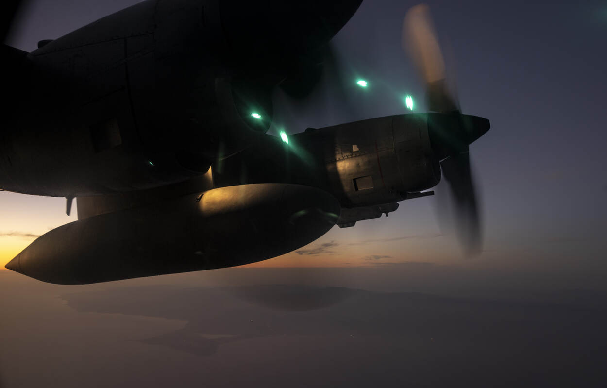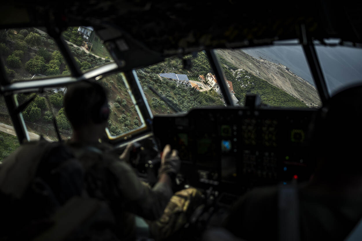 Een C-130 van de luchtmacht boven Cyprus, waar kapitein Anne als liaison na aankomst snel startte met het uitvoeren van verkenningen.