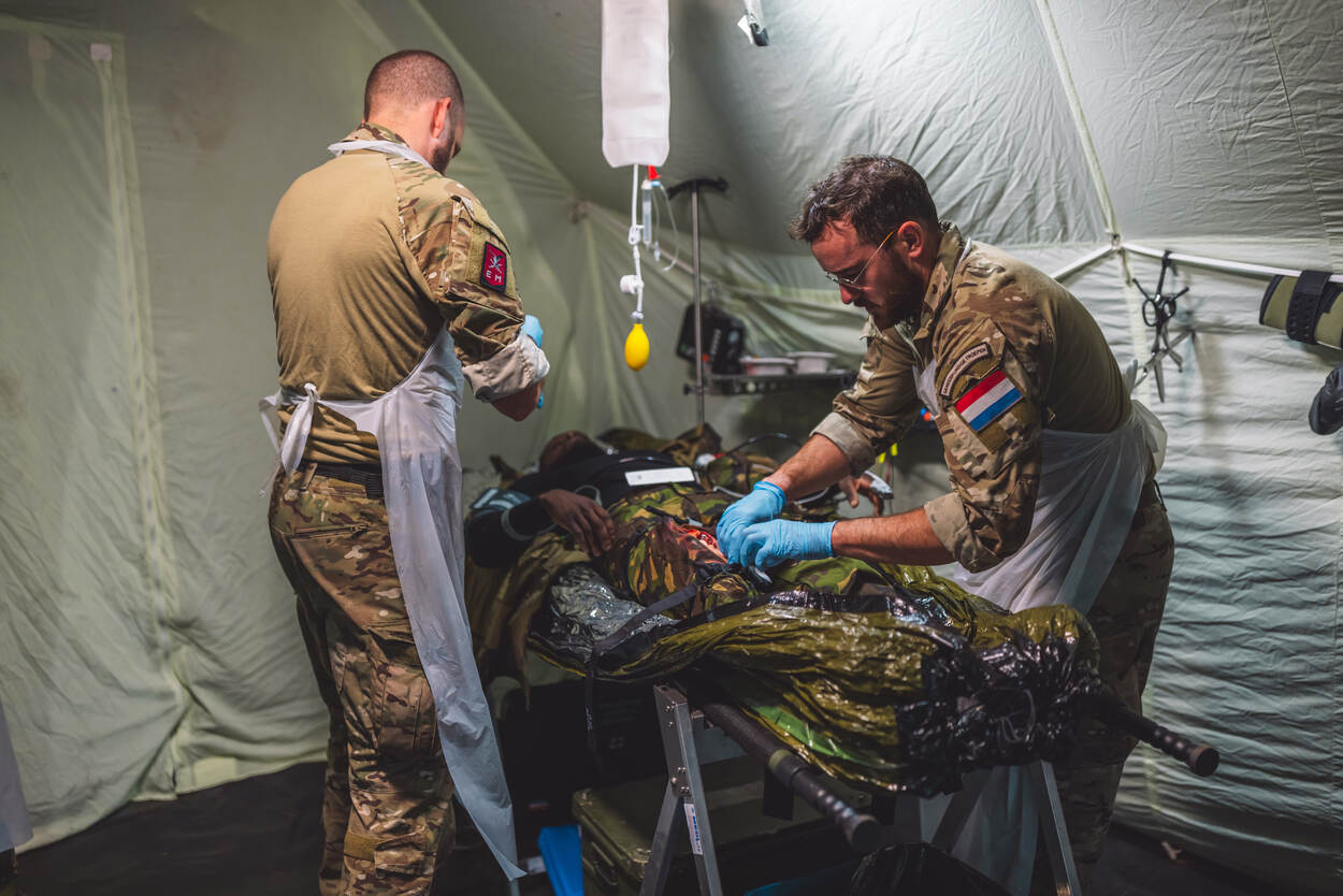 Primair oefendoel tijdens Falcon Autumn was het trainen en examineren van 12 Infanteriebataljon. Secundair was het beoefenen van de medische keten tot op Role 2 niveau. Daarbij worden gestabiliseerde gewonden van de Medical Treatment Facility (MTF), pal achter de voorste rand van het weerstandsgebied afgevoerd naar een militair of civiel hospitaal dat over uitgebreide behandelmethoden beschikt. Op de foto zie je medisch personeel in de MTF zich ontfermen over een LOTUS-gewonde.