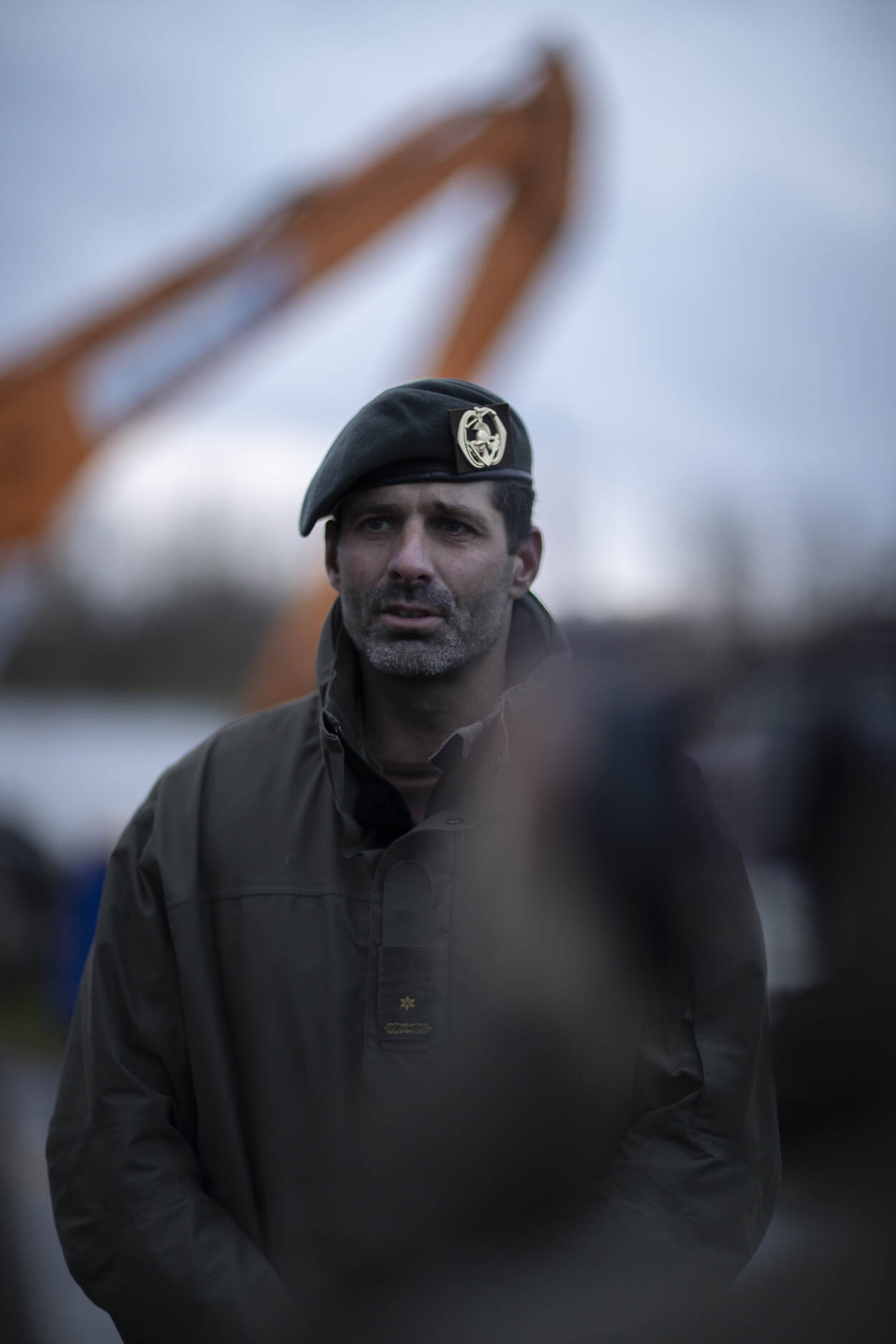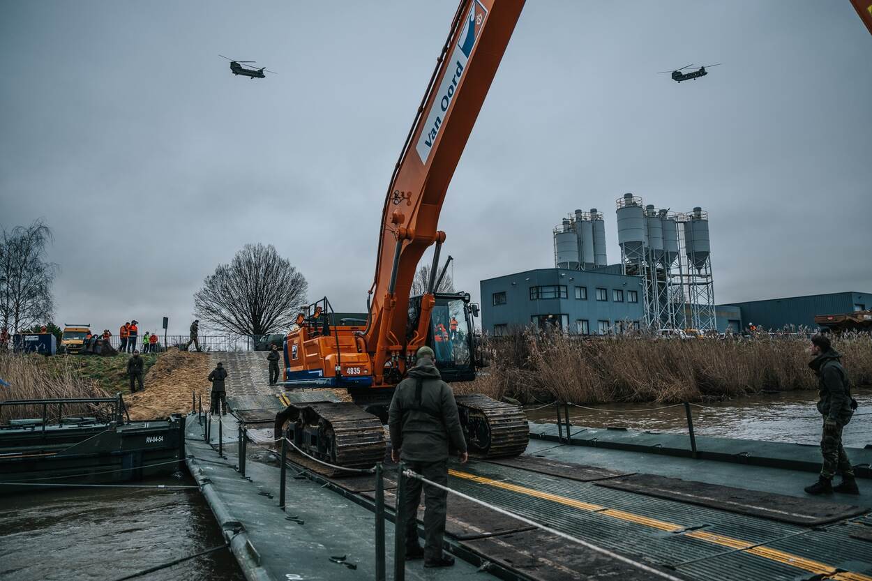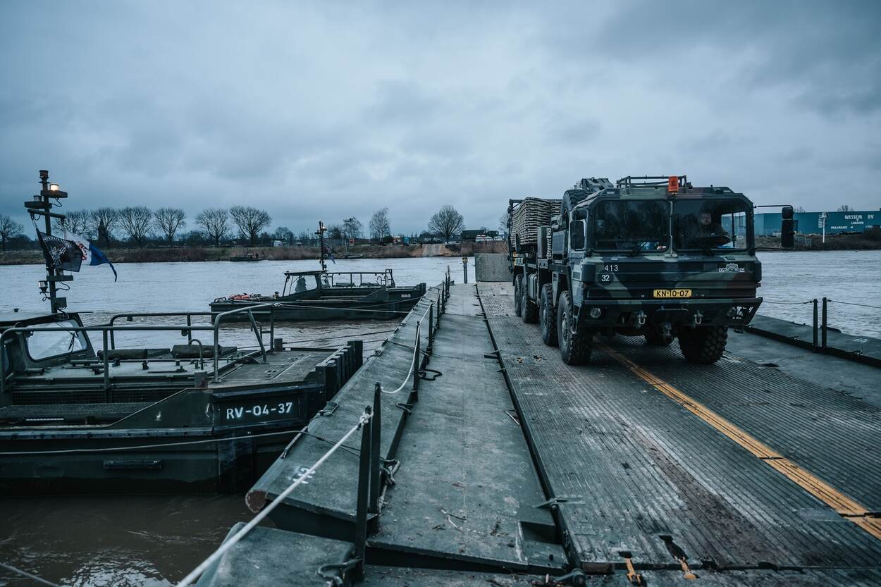 “Onze hulp is nodig, omdat civiele partijen dit werk niet kunnen doen”, zegt hij, terwijl de waterkoude wind aan de oever van de Maas toeneemt. Is een 45 ton zware graafmachine naar de overkant brengen dan geen probleem? “Normaal gesproken zetten we zware tanks over, dus dit lukt zeker.”