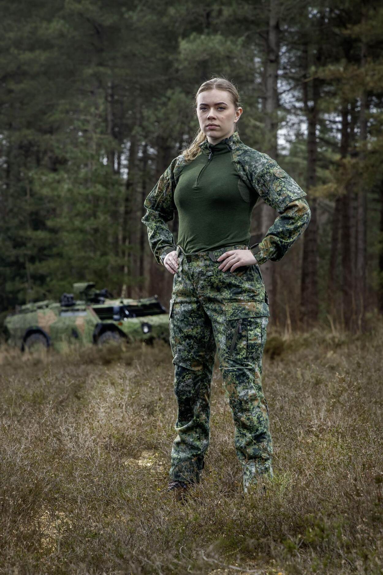 Een vrouwelijke militair toont het nieuwe tenue, op de achtergrond staat een militair voertuig.