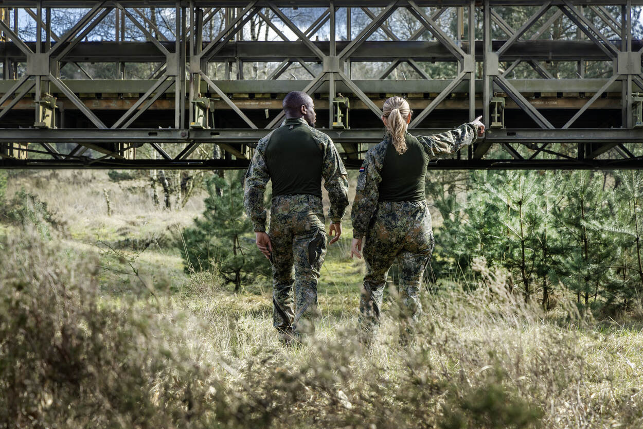 Twee militairen in nieuwe kleding lopen gezamenlijk richting een brug in de verte.