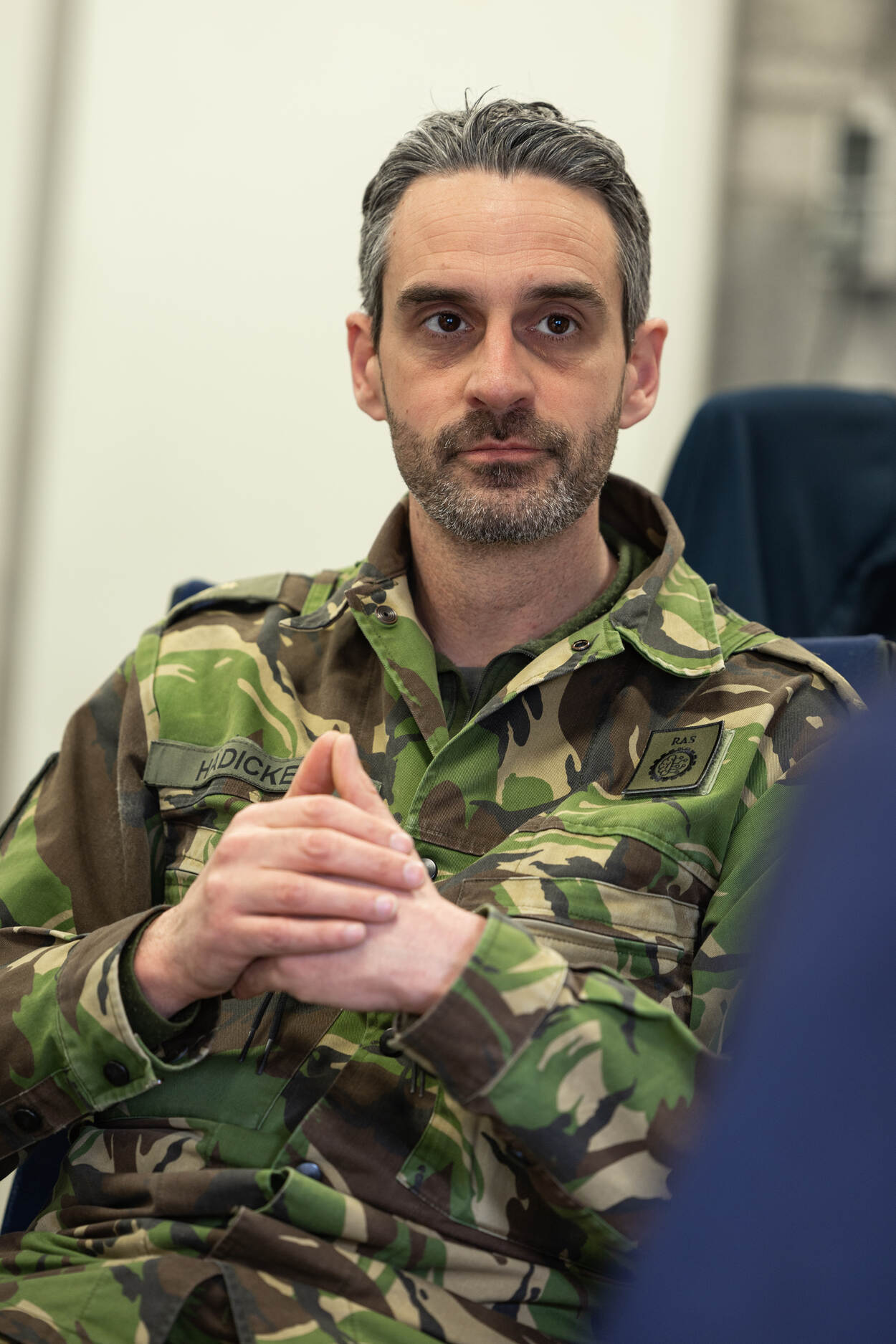 Luitenant-kolonel Martijn Hädicke luistert, zijn handen gevouwen.