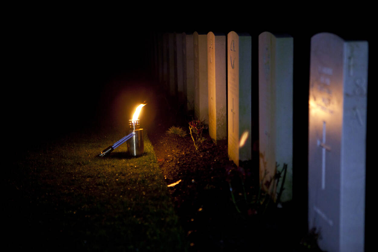 Foto van de oorlogsgraven in Oosterbeek, in de avond met een fakkeltje.