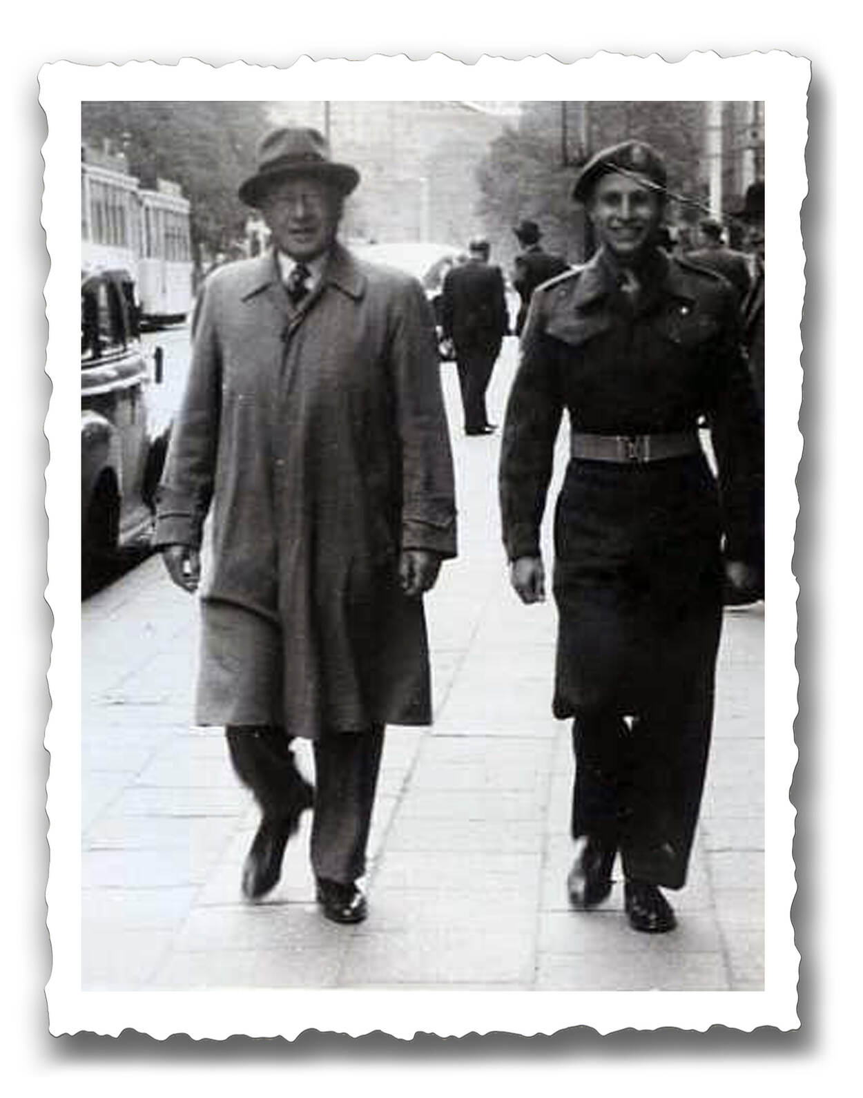 Brussel, 1944. Twee mannen lopen door de straat. Op links: de vader van Max Wolff. OP rechts: Max Wolff, vlak na de bevrijding van de Brusselse hoofdstad.