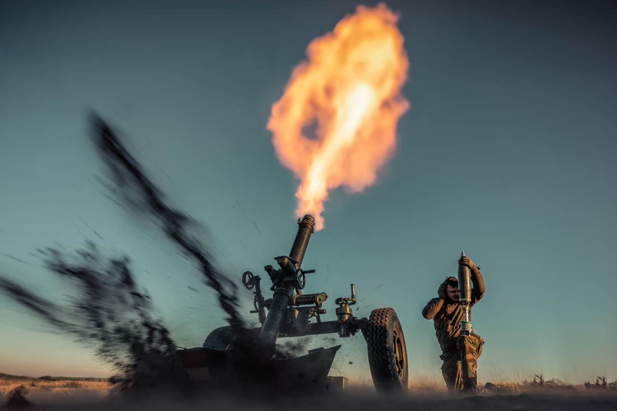 een mortier schiet een granaat af.