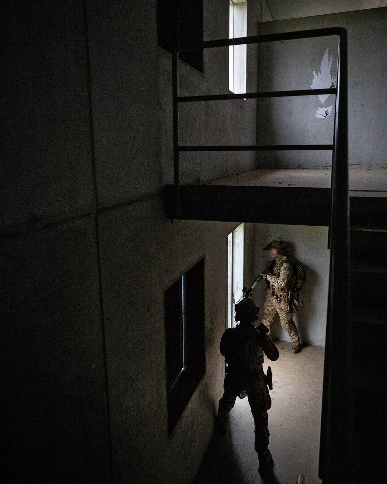 Ook de leerlingen nemen de programmawijziging voor lief. Geen gezeur. Focus! Dáár draait het om in de VCO, het (verplichte) vervolg op de Elementaire Commando Opleiding (ECO) waarin de rekruten de basisvaardigheden van het commandobestaan krijgen bijgebracht. Als onderdeel van het Direct Action-programma manoeuvreren de VCO’ers behoedzaam langs de gevels naar de voordeur van het eerste doel. Onder dekking van de invallende duisternis zuiveren ze de 3 huizen van vijand. “Konden jullie het goed volgen?”, vraagt sergeant Diego in de debriefing. Ja, luidt het antwoord. Diego heeft een tip. “Maak altijd tempo en bewaar de rust. Mannen, het is fijn werken met jullie.”