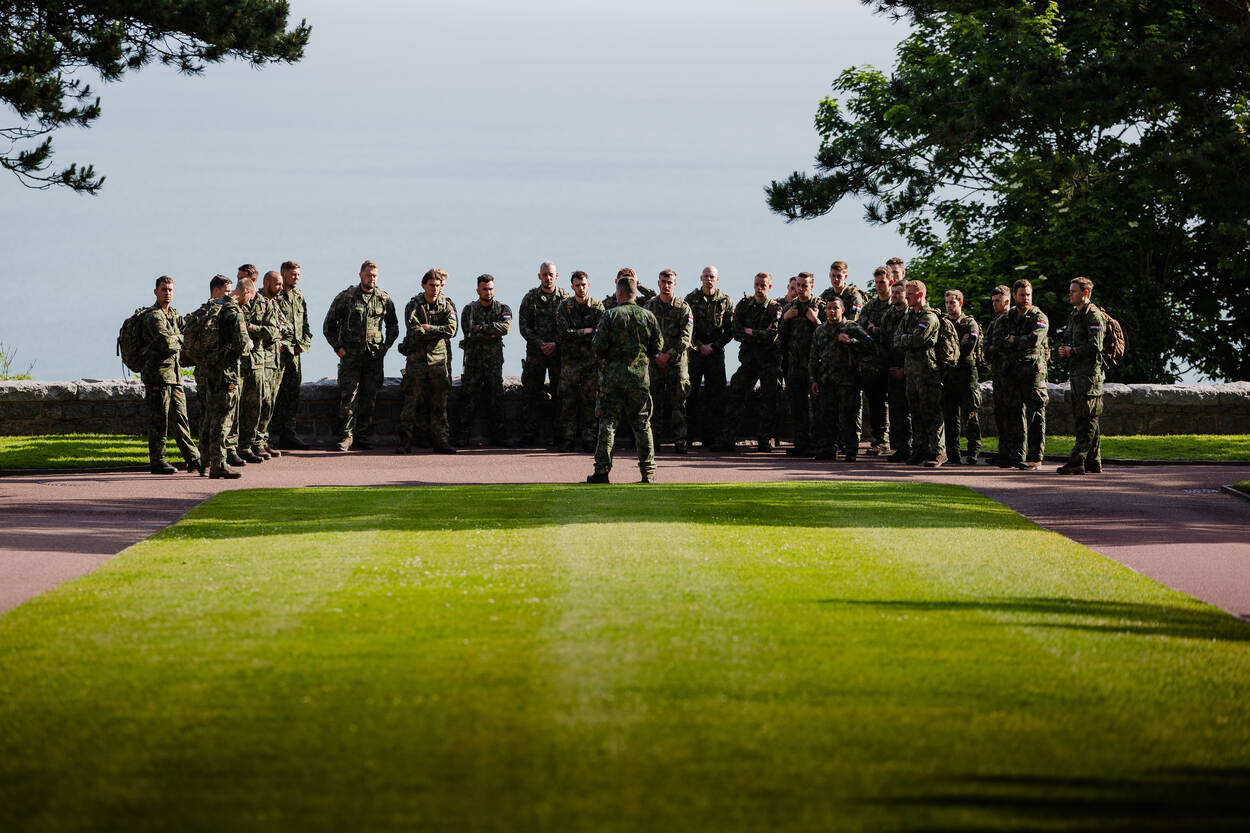 Na een eerste stop van de tour bij de Amerikaanse begraafplaats in Colleville-sur-Mer, bevindt de Charlie-compagnie zich halverwege de ochtend bij de voormalige Duitse verdedigingsstelling ‘Widerstandsnest 62’. Zwijgend kijken fuselier-1 Justin en fuselier-2 Maurits naar de blauwe zee bij Omaha Beach. Rustig nemen de twee de tijd om de informatie van de tweede presentatie van de dag in te laten werken. “Het is moeilijk te beseffen wat hier allemaal is gebeurd. Maar het maakt wel dat wij hier nu vrij rond kunnen lopen”, zegt Maurits. “Als je hier bent, besef je nog meer dat we dit werk niet voor niets doen.” Een Amerikaanse Dakota vliegt ondertussen luid brullend over. Hoewel zijn buddy Justin Normandië al wel eerder bezochdt, blijft het voor hem een bijzondere locatie. “Het is een eer om hier opnieuw naartoe te gaan.”