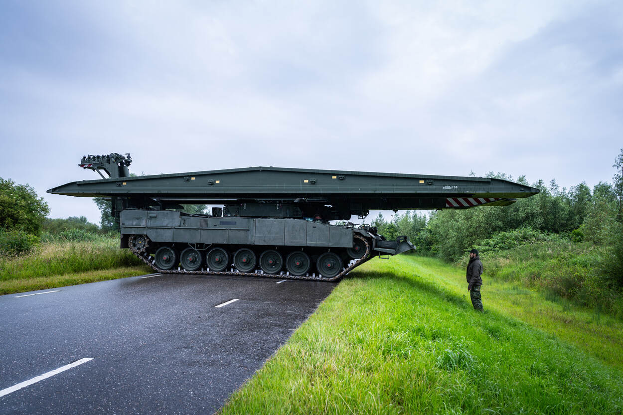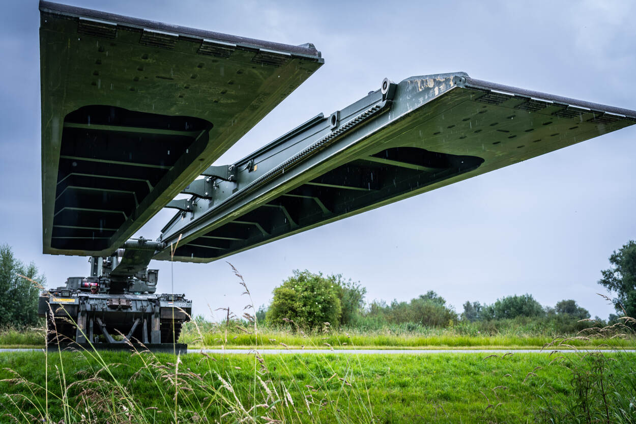 Binnen een mum van tijd maken de militairen met de Leguaan de brugslag.