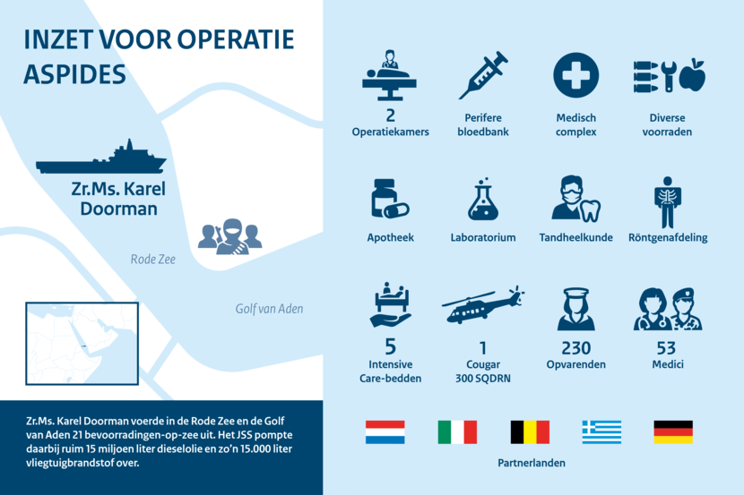 De missie was niet zonder risico’s, zowel voor de opvarenden van de NAVO-eenheden, als van de koopvaarders die werden begeleid. Vandaar dat de aanwezigheid van een drijvend hospitaal een geruststellende uitwerking had. Aan boord van het Joint Support Ship (JSS) Zr.Ms. Karel Doorman bevond zich een uit de kluiten gewassen medisch team van Nederlandse en Zweedse militairen. Klaar voor als ‘de klap’ zou komen, mochten Jemenitische Houthi’s kwaad in de zin krijgen.
