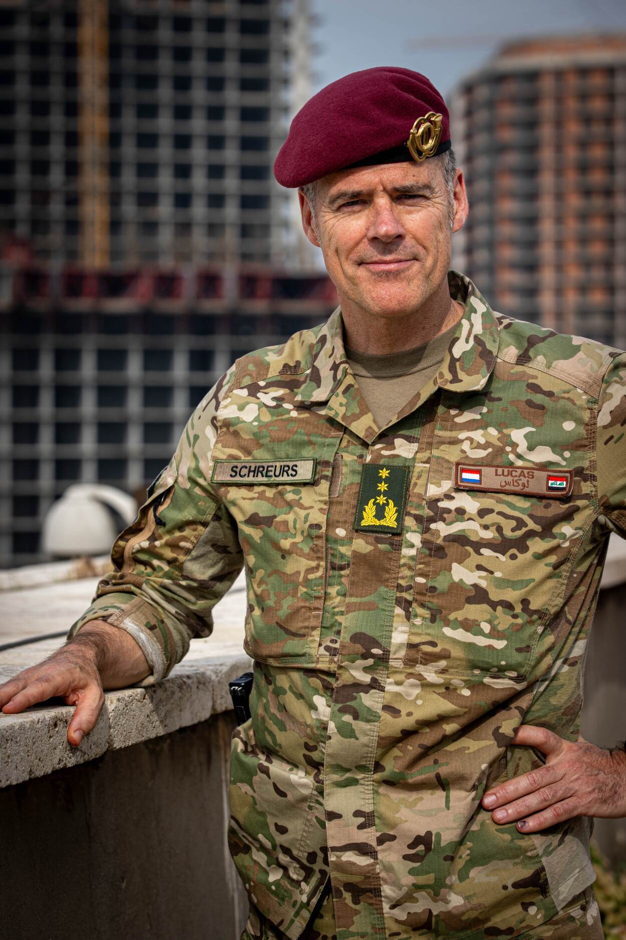 Op het dak kijkt Schreurs uit over Bagdad. Rond de Victory Arch met de iconische zwaarden en Union III, omringen steigers appartementencomplexen in aanbouw. Ernaast verrijst een spierwit hotel dat ’s nachts oplicht en verderop zijn bouwkranen in de weer.
