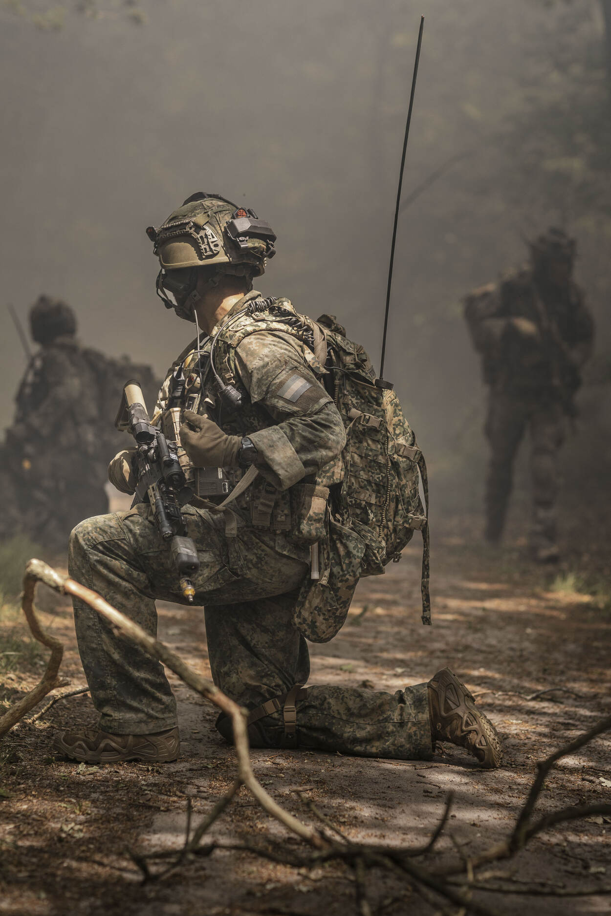 Ondertussen staan de Australische herder Knud en zijn bazinnen (‘we liepen er per ongeluk in’) met grote verbazing te kijken naar het brute geweld van de helikopters en de aanstormende militairen van de Charlie-compagnie. Soldaat-1 Wouter merkt dat er sinds hij 6 jaar geleden in dienst is gekomen, heel wat verandert in het optreden. “We zijn in Irak geweest. Daarvoor hebben we ons voorbereid op hoofdtaak 2; het was meer een politie- en bewakingsmissie. Dit is echt grootschaliger, duidelijk voor hoofdtaak 1 (de bescherming van het eigen en Navo-grondgebied, red.).” Collega soldaat-1 Bas is pas anderhalf jaar in dienst. “Jammer genoeg kan ik door een blessure niet echt meedoen. Dit is toch een actie waarvoor je bij 11 Luchtmobiele Brigade zit.”