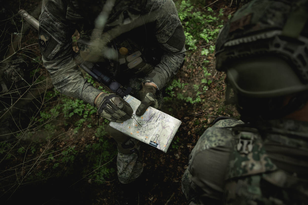 Militairen lopen door Duitsland. Een geïmproviseerde boskaart.