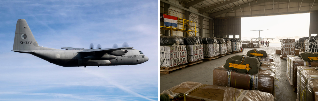 Links een vliegende, grijze Hercules. Rechts bundels noodgoederen met een parachute bovenop staan klaar voor transport.