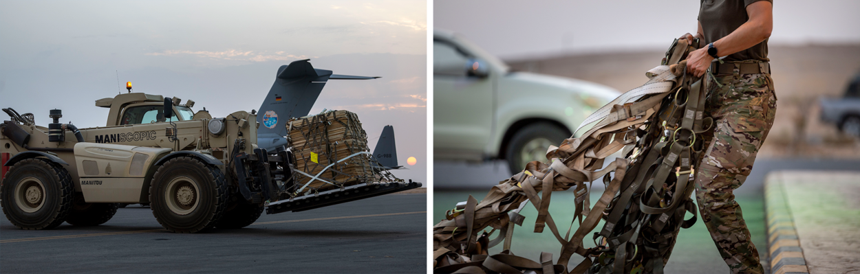 Links een vorkheftruck met daarop een bundel noodhulp. Rechts een militair die sleept met een soort net.