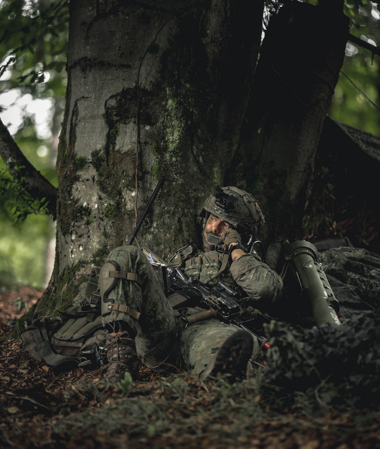 Vanuit de bosrand houdt een Nederlandse militair zijn sector nauwlettend in de gaten.