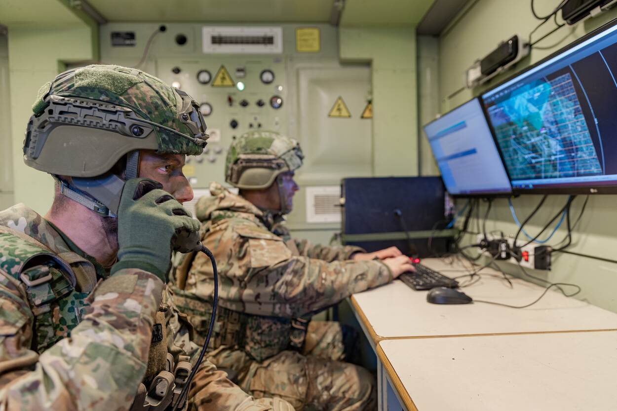 Twee militairen zitten achter computerschermen in een commandovoertuig.