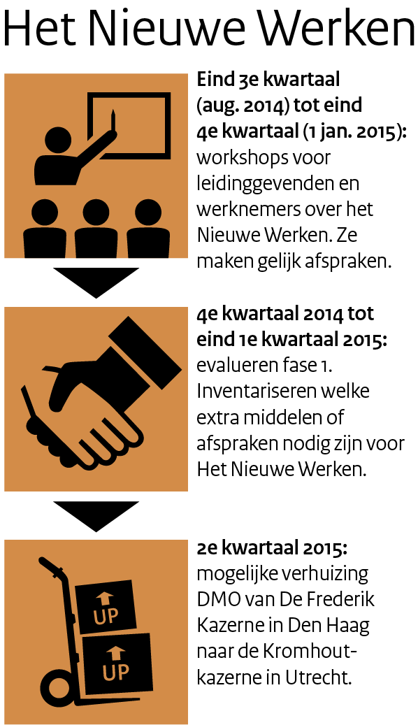 Om de theorie achter HNW toe te lichten, bereidt Verheijen samen met zijn werkgroep workshops voor. Na het zomerverlof, maar voor 1 januari 2015, moet iedere DMO’er op de hoogte zijn van de mogelijkheden van HNW. Tijdens de bijeenkomsten ligt er ook een taak voor de leidinggevenden. ‘Omdat zij aan het einde van de dag ook daadwerkelijk afspraken met hun werknemers maken. Het gaat dan om bijvoorbeeld te behalen resultaten, de verwachte aanwezigheid, bereikbaarheid en beschikbaarheid en het behouden van de teamgeest door formeel en informeel samenzijn.’ Ook de mogelijke randvoorwaarden voor HNW komen aan bod, hoewel die kunnen verschillen per niveau en per werknemer.