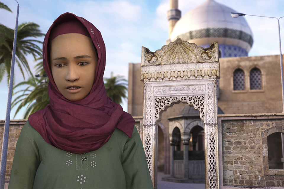 Met één druk op de knop stap je het woestijnlandschap binnen. Op de achtergrond klinkt oosterse muziek uit een stadje waar een moskee het middelpunt vormt. Op de voorgrond een Arabische man die je in gebrekkig Engels te woord staat.