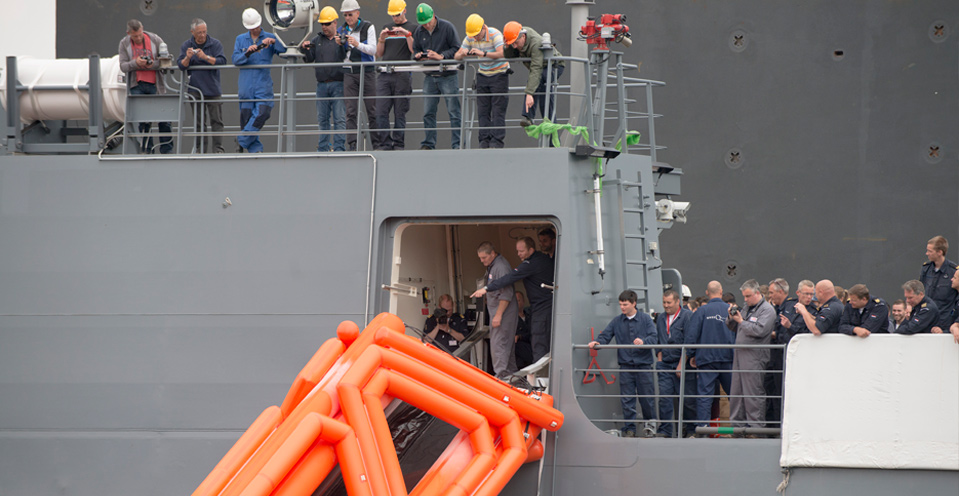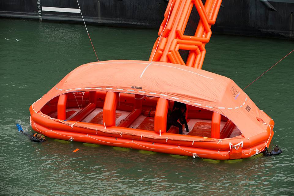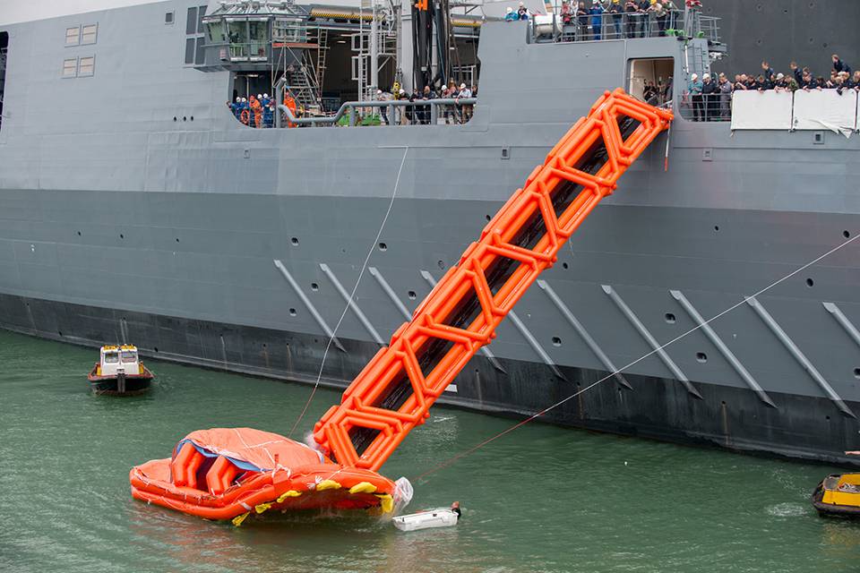 En snel ging het: tussen het uitrollen van de ‘glijbaan’ en het loskoppelen van het volle reddingsvlot zat nog geen 6 minuten. “De test is uitstekend verlopen en het systeem veilig bevonden”, stelt luitenant ter zee 2OC Roland Loos (DMO/MATLOG) vast. Hij is met Henny de Bruijn namens de afdeling Toezicht Defensie Leveranciers (TDL) vanaf het begin bij het scheepsbouwproject betrokken. Zij zien erop toe dat de marine de kwaliteit krijgt waar ze om vraagt.