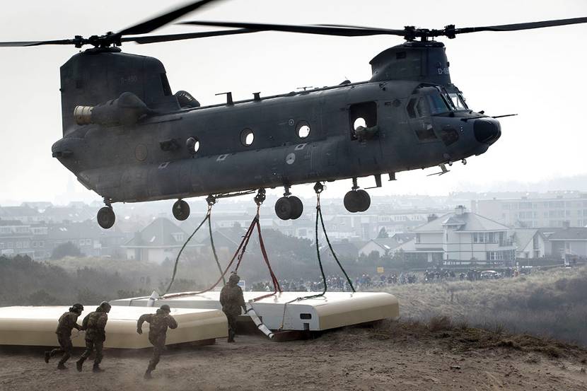 Een knap staaltje samenwerking vorige maand in Noordwijk. Een Chinook-transporthelikopter vervoerde daar een nieuw dak voor een bunker. De bunker is onderdeel van het Atlantikwall Museum. Kapitein Kees Oudshoorn en zijn mannen van DMO/MATLOG (Wapensystemen) zorgden voor een veilige uitvoering. “Missie geslaagd”, liet hij weten.