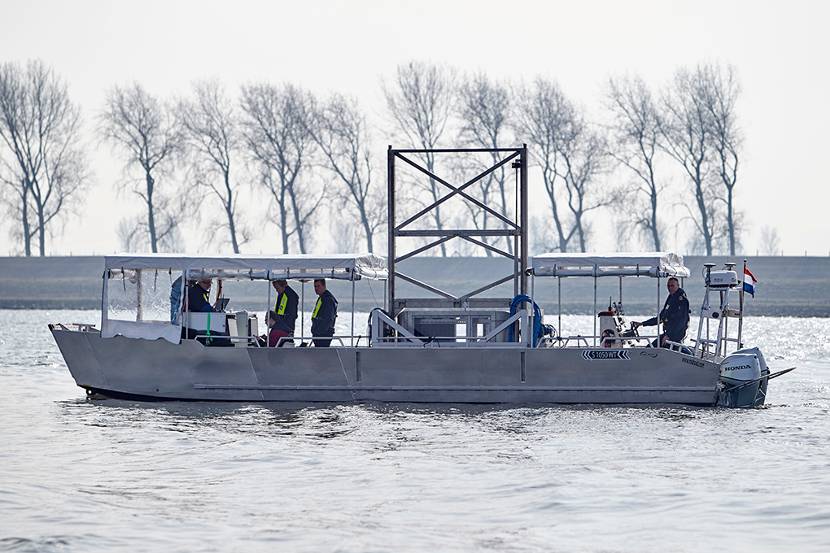 Afgelopen maand is op het Haringvliet de MUD-demonstrator getest. Dat is een laag-frequentiesonar om mijnen op te sporen die onder het zand of in de modder liggen. Tot nu kunnen namelijk alleen nog maar mijnen worden getraceerd die op de bodem liggen. De sonar is in opdracht van DMO ontwikkeld door TNO In het meinummer van Materieelgezien komt een uitgebreid artikel over deze noviteit. (Foto: Vincent Basler)