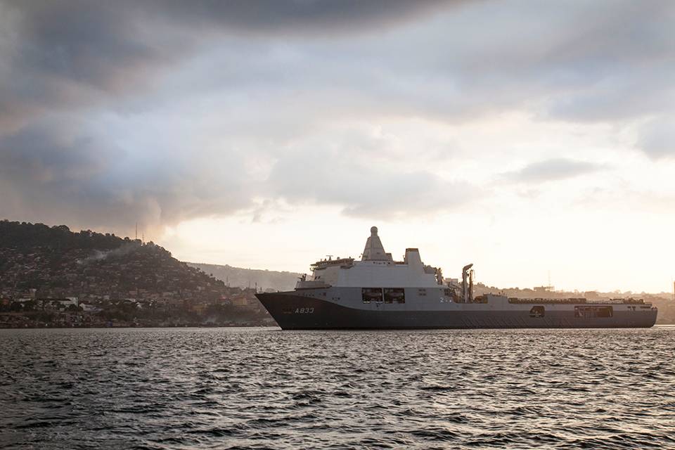 De Karel Doorman voert over een periode van zo’n 3 maanden 2 transporten met hulpgoederen uit. Tientallen containers, voertuigen en pallets vinden hun weg naar havens in Guinee, Sierra Leone en Liberia.