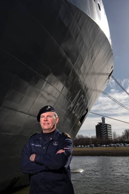 De laatste keer dat de krijgsmacht een schip nog voor de overdracht aan de marine inzette? Die kan de projectleider JSS, kapitein-ter-zee Paul de Leeuw, zich nog wel voor de geest halen. 1998, Kosovo. “Ik was eerste officier op de Rotterdam toen we op stel en sprong spullen voor de Gele Rijders naar Macedonië moesten brengen.” Dus toen midden september het telefoontje van het ministerie kwam, keek hij er niet van op. “Ik wist: dit kan ook een kans zijn.”