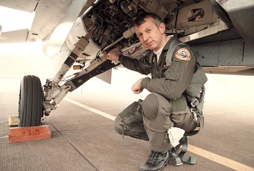 Oud-vlieger Tjebbe Haringa bij de landinggear.