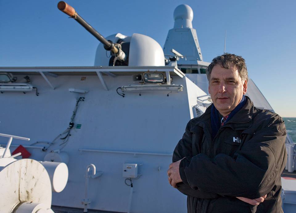 Projectleider Rob Zuiddam tijdens de proefvaart aan boord van het OPV Holland