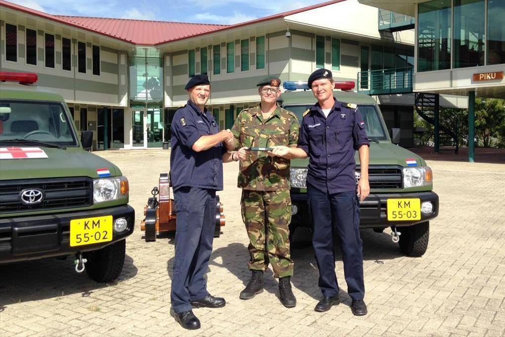 Projectleider majoor Jacko Rijzenga heeft namens DMO 5 nieuwe ziekenauto’s overgedragen aan de Commandant der Zeemacht in het Caribische Gebied, commandeur Hans Lodder.