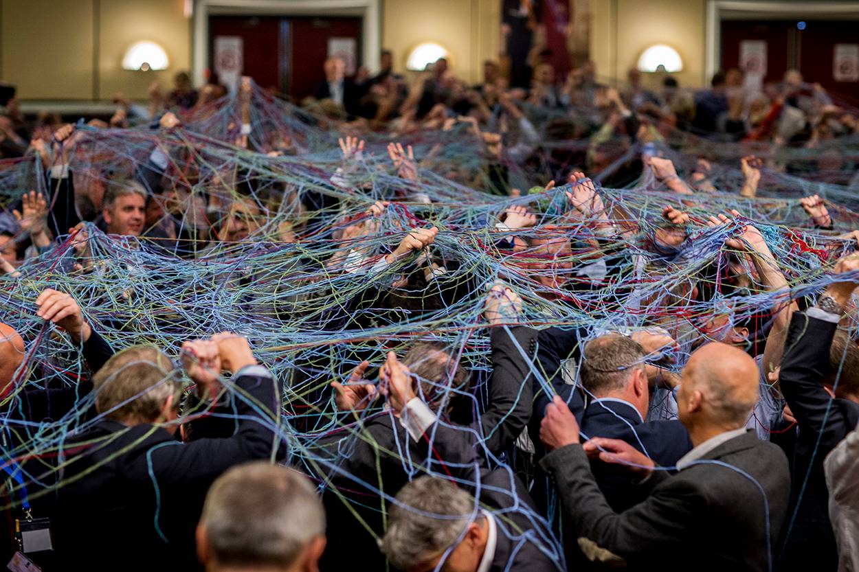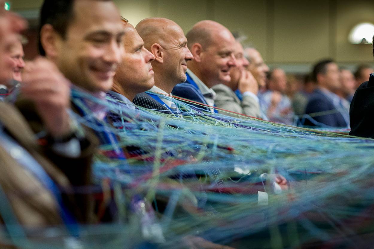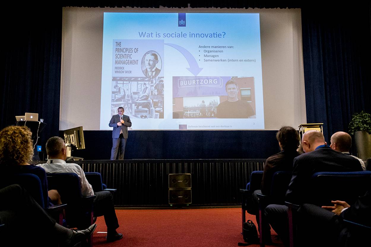 Ruim 400 medewerkers vanuit alle Defensie-onderdelen bezochten het Symposium in de bioscoopzaal van de Generaal-Majoor de Ruyter van Steveninckkazerne in Oirschot. Sociale innovatie gaat over wie je bent, met al je talenten en eigenaardigheden, en hoe je je zo kunt inzetten dat de organisatie innoveert en profiteert. Met Buzzmaster, een interactief systeem waarmee iedereen in real time via zijn telefoon vragen kan beantwoorden, werden alle bezoekers gedurende de gehele dag uitgenodigd om vragen te beantwoorden en feedback te geven. Op de vraag ‘ hoe innovatief vind je jezelf?’ antwoordde 55 procent zichzelf redelijk innovatief te vinden. Defensie als geheel kreeg een magere 5,2 voor de mate van innovatie. Michiel Hesseling, die bekend staat als de man die organisaties in beweging krijgt, liet bolletjes wol door de zaal werpen. Al die lijntjes die ontstaan laten zien dat je elkaar moet opzoeken, elkaar moet versterken en kennis moet uitwisselen. “Voel de verbinding. Stap op elkaar af en deel je kennis, je talent en deel je ervaring.” Brigadegeneraal-arts Johan de Graaf hield een sterk en eerlijk verhaal. “Onze uitdaging is om mensen sterker te maken, beter uit te rusten om die uitdagingen het hoofd te kunnen bieden. Je zou moeten groeien van stress en prikkels zoals een spier na lichte overbelasting. Het vereist samenwerking en continue dialoog van maatschappij, organisatie en de individuele medewerker.” Hoofddirecteur Bedrijfsvoering schout-bij-nacht Maarten Tossings vroeg iedereen eens in een ander bedrijf te kijken. “Zet de luiken open”. Sommige punten van sociale innovatie zijn niet overal inzetbaar. “Als je tijdens een missie onder vuur ligt, kun je moeilijk in werkoverleg gaan.” Als iemand de woorden van SBN Tossings kan bevestigen, is dat kolonel Jelte Groen. De commandant van het Korps Commandotroepen constateerde dat het KCT al aan sociale innovatie deed voordat de term ontstond. “We stimuleren en enthousiasmeren onze militairen in zelfsturing. Het komt bij ons voort uit noodzaak. Onze mensen moeten zelfstandig in een missie kunnen opereren en beslissingen durven nemen.”